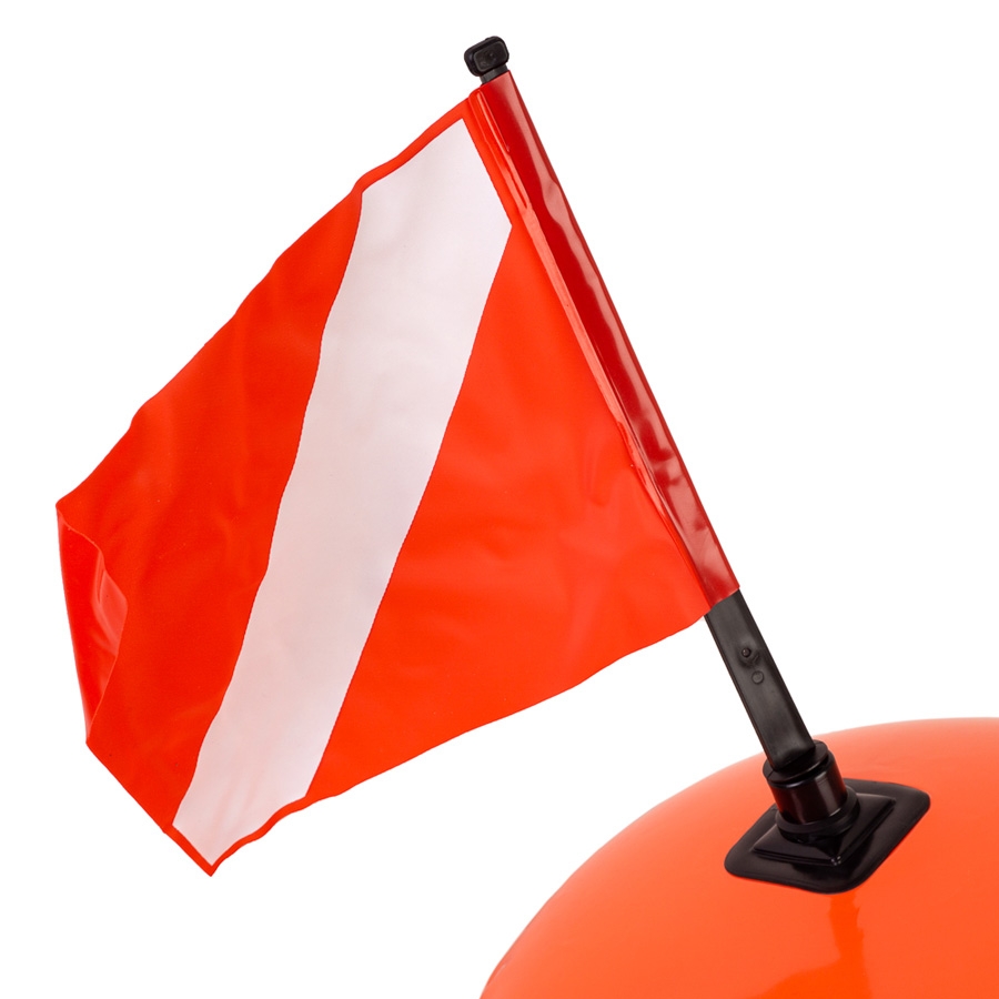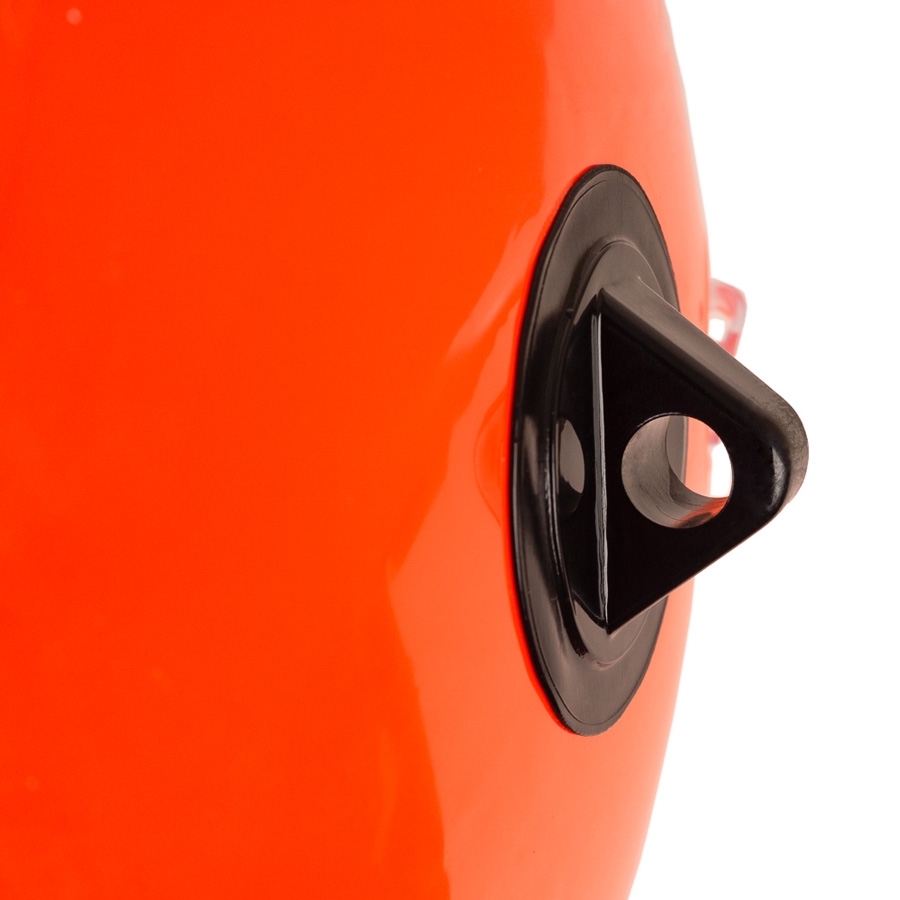 A nylon signaling buoy featuring an air chamber made from highly durable PVC material. It’s highly visible even from a considerable distance due to the flag and its bright coloring. Reinforced perpendicularly with three rows of 3 cm tape and one row longitudinally. At the top of the buoy, there are 3 pockets, 2 straps with ‘hook and loop’ closures, and 10 plastic rings. Additionally, six ‘hook and loop’ straps are positioned at the bottom of the buoy, allowing the attachment of up to three spearguns. Four plastic hooks at the bottom are for securing additional accessories.