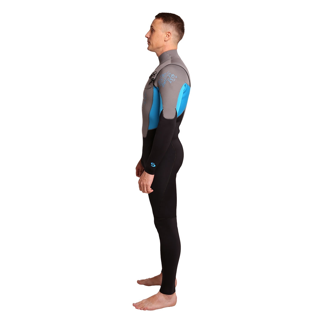 The lower front and back parts of the wetsuit and knee panels are made of thicker 3mm neoprene and are protected by a textile coating on both sides. The sides of the wetsuit, sleeves, collar, pants below the knees and crotch are made of thinner 2mm neoprene for greater elasticity to make the suit more tightly fit the figure and keep warm without restricting movement.