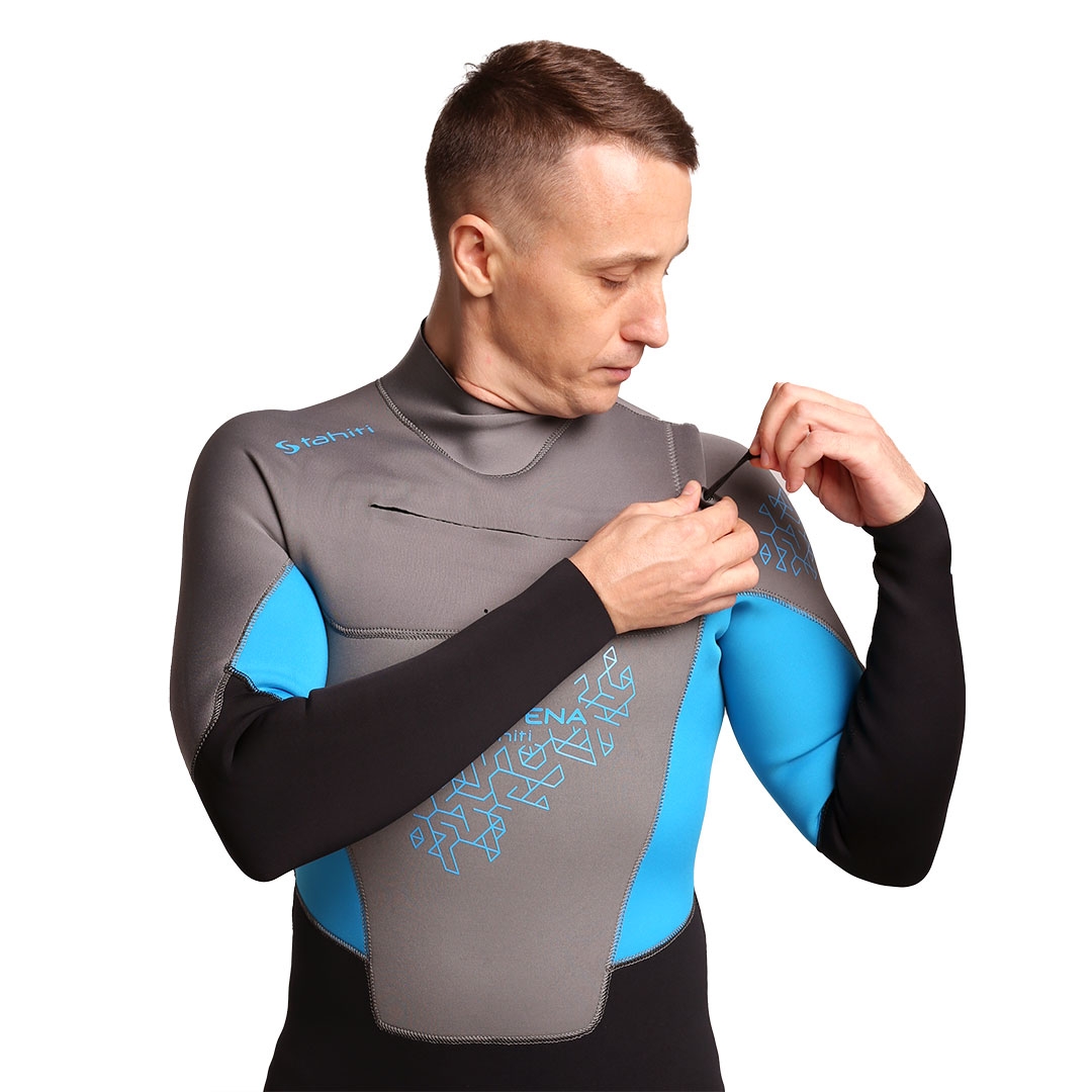 The suit is fastened with a vertically placed plastic zipper on the back, which is corrosion-resistant in salty seawater. For convenience, the zipper pull tab is equipped with a long loop with a textured surface.