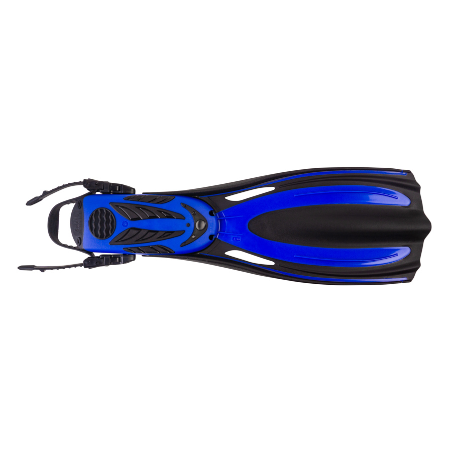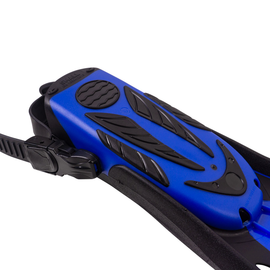 The fin blade is made of two different materials, enhancing flexibility, comfort, and delivering a high level of propulsion. The central part of the blade, made from elastic rubber, forms a tunnel during the stroke, preventing water from flowing into the low-pressure zone (on the reverse side of the blade) through the side edges. This directs water towards the end of the blade, increasing the power of the stroke while reducing energy loss—a design referred to as the “tunnel effect.”