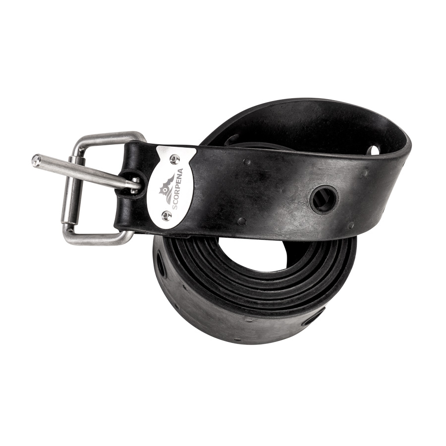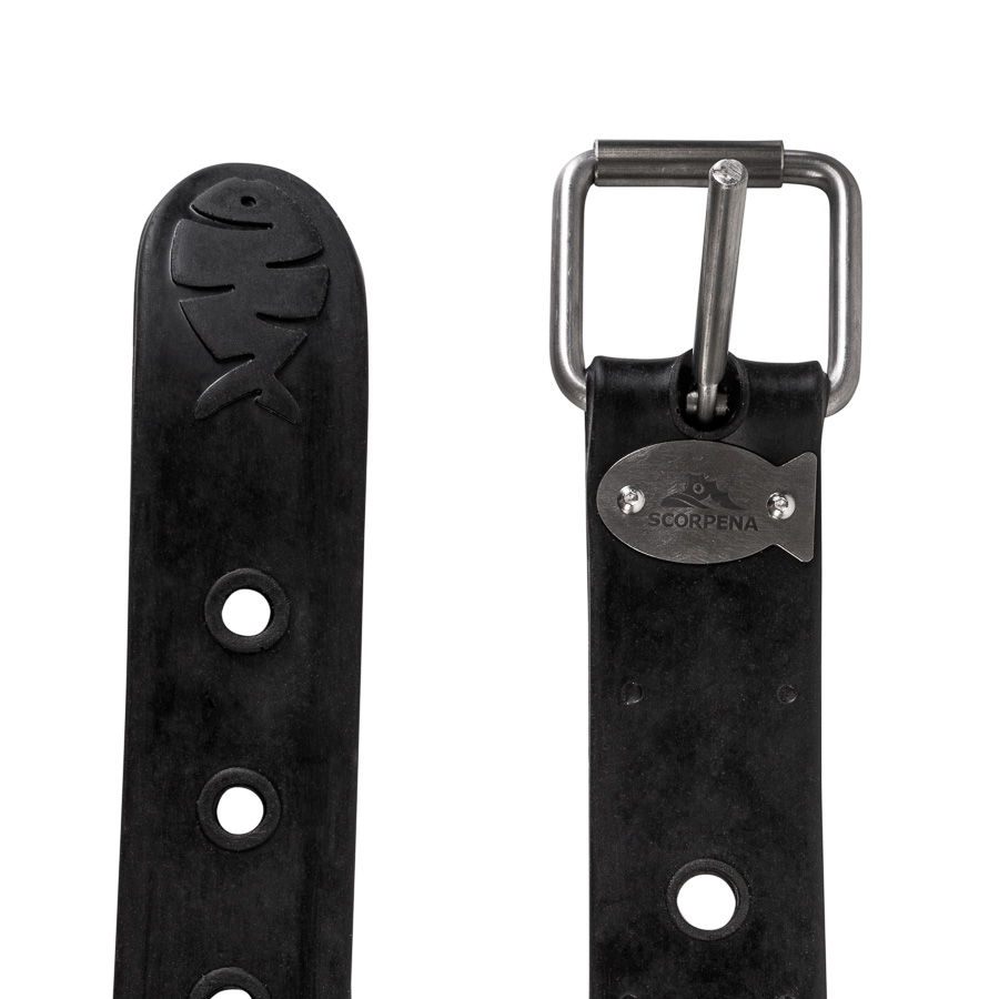 Rubber belt with a black Marseille-type buckle has a total weight of 290 grams, made from elastic 4mm thick and 45mm wide webbing, featuring 17 adjustment holes with a diameter of 10mm spaced 40mm apart.