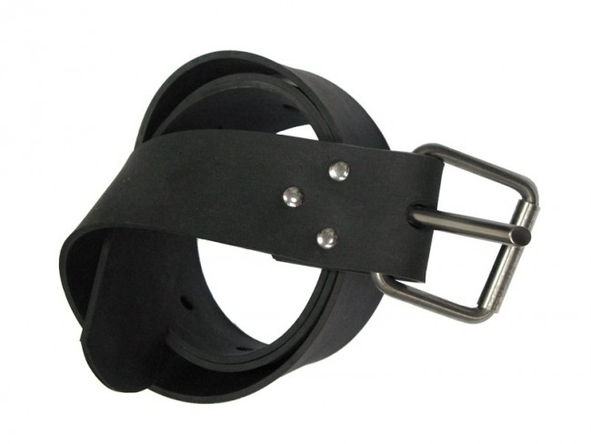Rubber belt with a black Marseille-type buckle has a total weight of 290 grams, made from elastic 4mm thick and 45mm wide webbing, featuring 17 adjustment holes with a diameter of 10mm spaced 40mm apart.